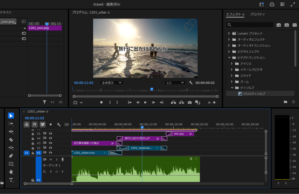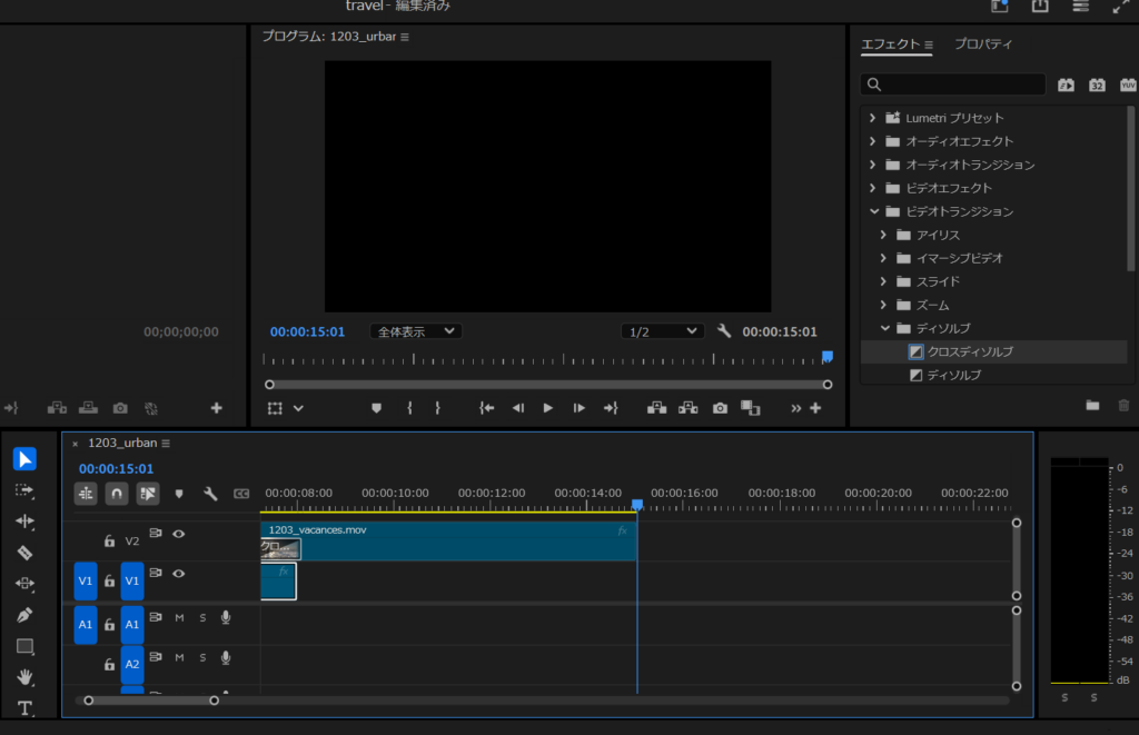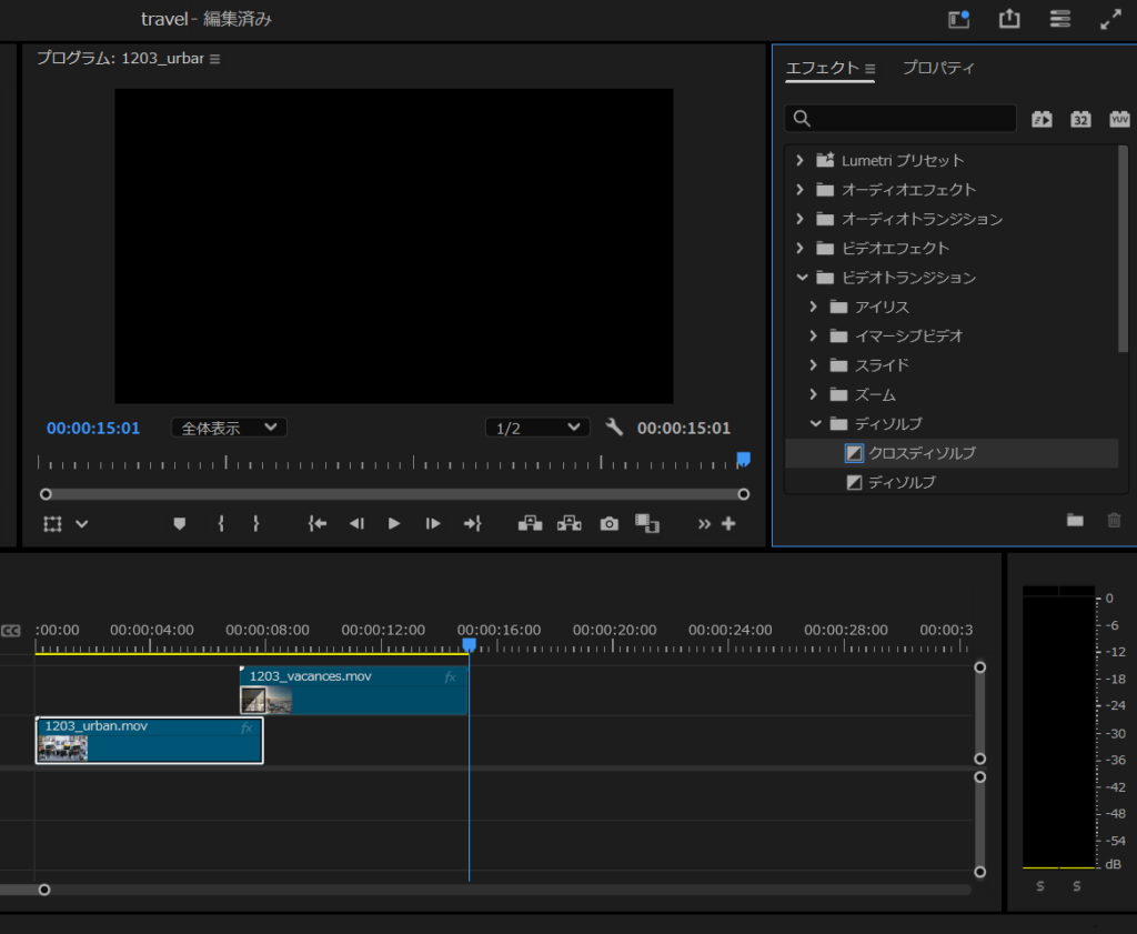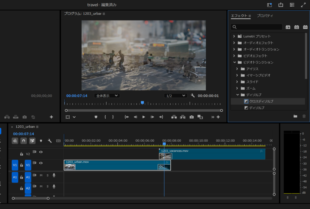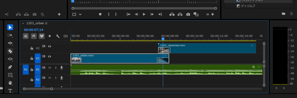 クロスディゾルブを両方の動画に入れることにより、終わりと始まりがゆっくり消えていく