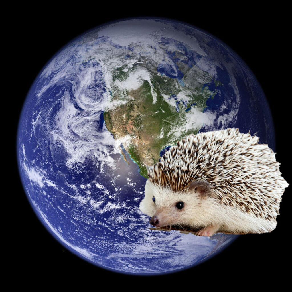 ハリネズミと地球の画像をマスキングとレタッチ作業で合成